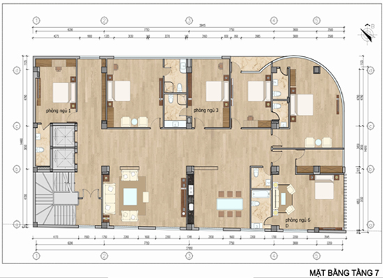 Căn hộ được chia thành 6 phòng ngủ (mỗi phòng đều có WC riêng), 01 phòng khách, 01 phòng bếp, 01 WC chung.