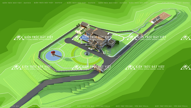 Thiết kế biệt thự hiện đại 3 tầng nằm trong tổng thể khu đất rộng lớn. Cảnh quan được bố trí hài hòa, eco. Tổng thể thiết kế biệt thự bao gồm 1 căn biệt thự được đặt chính giữa khu đất, căn nhà thờ được đặt bên canh. Đằng trước là bố trí cảnh quan, cổng chào, hồ điều hòa, các chòi nghỉ. Đằng sau là khu trồng cây ăn quả vàcanh tác. Thiết kế biệt thự nằm trên đồi cao, có bể bơi hòa quện với thiên nhiên sẽ là một biệt thự nghỉ dưỡng lý tưởng cho gia đình.,